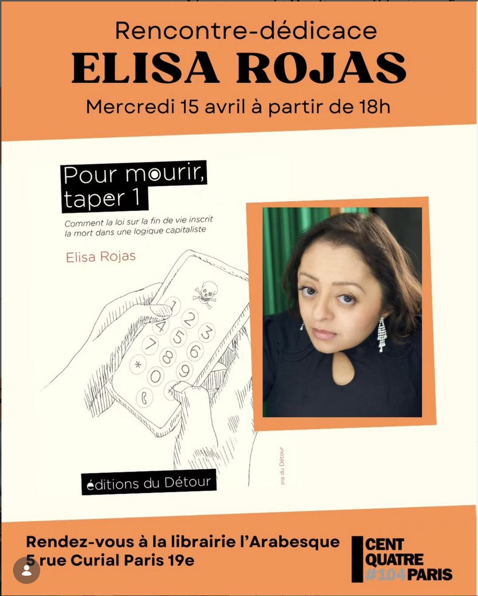 Elisa ROJAS @elisarojasm · Twitter · 2026-04-08 16:56 UTC #SaveTheDate Le lancement de mon livre se fera à la Librairie L'Arabesque du 104 à Paris 19, le 15 avril prochain à partir de 18h. Faites tourner au maximum et venez !