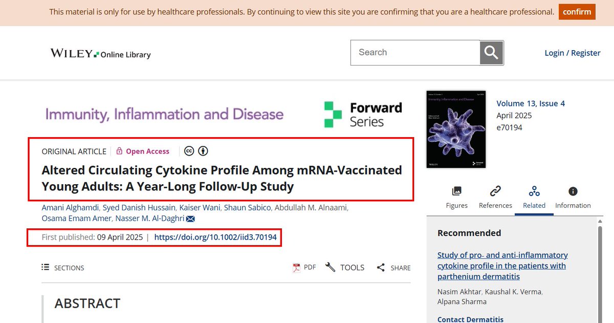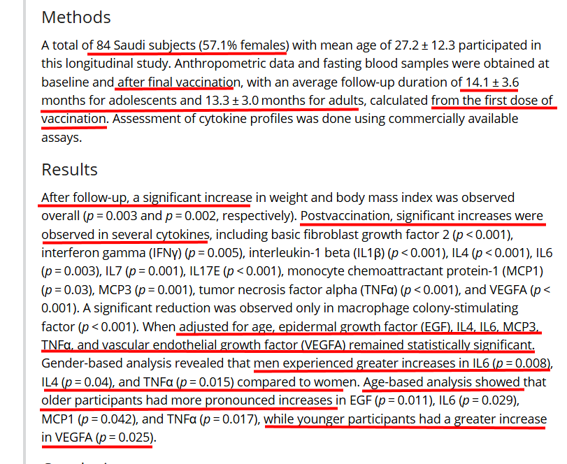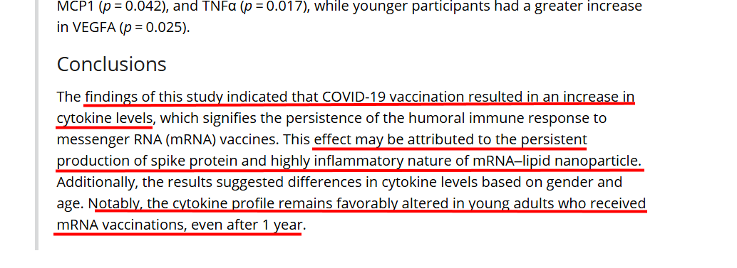 🚨📢ALARMING! Saudi Researchers publish new study (9 Apr 2025) demonstrating long-term effects of mRNA COV-19 Vaccine spike protein, possibly persisting (non-stop production) in blood causing increased circulating cytokines even one year after vaccination, remaining altered in young. Do people understand that this is another independent study that corroborates many others, indicating non-stop production of vaccine spike protein/inflammation for more than year and persisting, particularly in young people????? Do....you...understand!? "84 Saudi subjects (57.1% females) with mean age of 27.2 ± 12.3 participated in this longitudinal study" "follow-up duration of 14.1 ± 3.6 months for adolescents and 13.3 ± 3.0 months for adults, calculated from the first dose of vaccination." "After follow-up..post vaccination, significant increases were observed in several cytokines." "Age-based analysis showed older participants had more pronounced increases in EGF, IL6, MCP1 and TNFα, while younger participants had a greater increase in VEGF-A" Note: excessive or dysregulated VEGF-A can contribute to disease development, particularly cancer and cardiovascular disorders. CONCLUSIONS: "findings of this study indicated that COVID-19 vaccination resulted in an increase in cytokine levels" "This effect may be attributed to the persistent production of spike protein and highly inflammatory nature of mRNA–lipid nanoparticle." "Notably, cytokine profile remains favorably altered in young adults who received mRNA vaccinations, even after 1 year." "recognition of distinct adverse symptoms associated with gender and age provides an opportunity to enhance comprehension..to create vaccines that are safer and more efficient." Source: https://onlinelibrary.wiley.com/doi/10.1002/iid3.70194