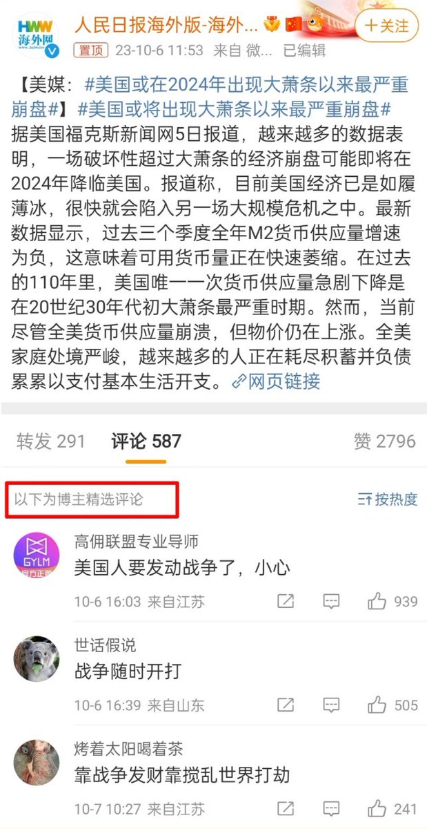 网友投稿 今日微博热搜,“美国或在2024年出现大萧条以来最严重崩盘”。