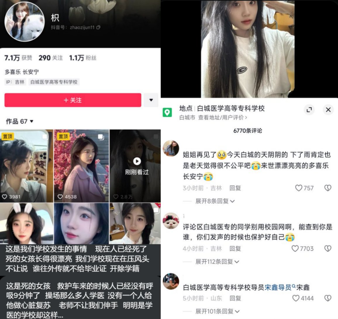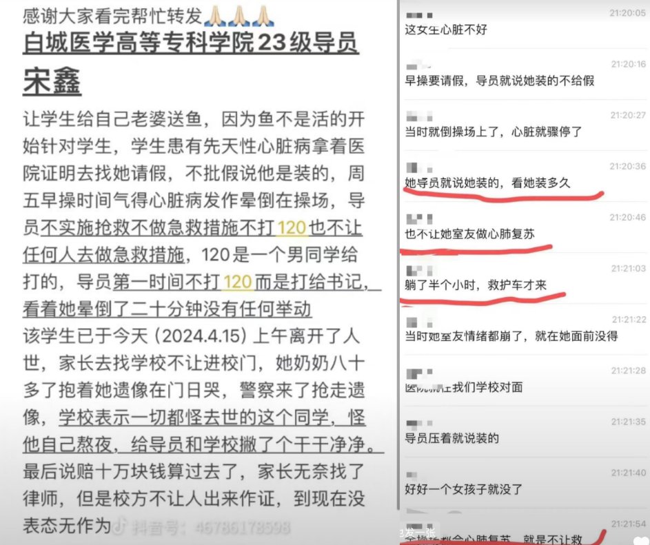 4月15日,网传白城医学高等专科学院一名学生上周五早操时心脏病发作晕倒在操场,但现场辅导员未及时采取施救措施延误了抢救时机导致学生死亡。 根据网传描述,此前辅导员曾让该学生给自己家属送鱼,但因为鱼不是活的导致其开始针对这名学生。之后学生因先天心脏病请假时遭到其拒绝,称其是装的。最后发生悲剧时亦没有立即采取必要的急救措施。 据本校学生称,救护车来的时候人已经没有呼吸9分钟了,且现场都是学医的,但老师不让学生们对其进行心脏复苏。 15日上午,家属前往学校维权,期间被警察抢走遗像。学校则将责任推给学生熬夜,计划赔偿10万元。 这一事件引发了学生以及网友们的愤慨。 尽管学校以开除和不发毕业证要挟学生禁止外传,但是学生和网友们依然将事情在网上接力转发。 同时,大量的网友前往女生社交媒体主页留言悼念。