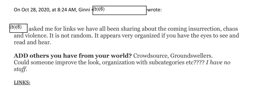 Screenshot of an email sent by Ginni Thomas. In part, the email reads: "[Redacted] asked me for links we have all been sharing about the coming insurrection, chaos, and violence. It is not random. It appears very organized if you have the eyes to see and read and hear."