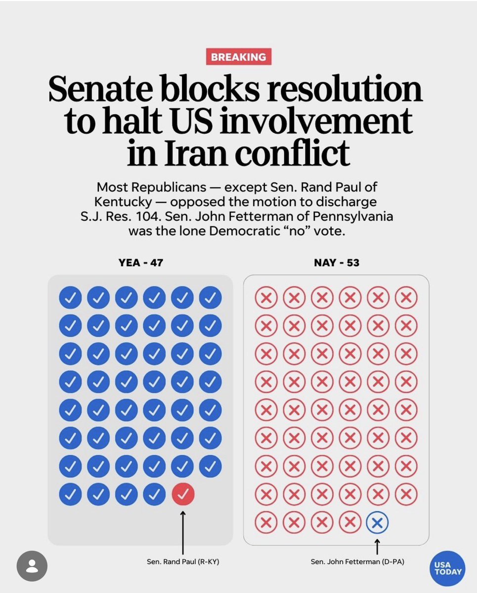 Grazie alla compattezza dei repubblicani (salvo Rand Paul) e il voto del democratico Fetterman, ormai il piú oltranzista a favore di Israele nel suo partito. Fallisce la mozione sui poteri di guerra al congresso Adesso é una guerra 100% repubblicana - certificato
