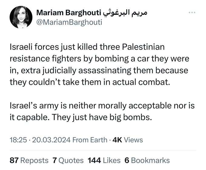 A reminder that what these people consider morally unacceptable is taking our terrorists that otherwise are trying to kill you... She views raping young girls, shooting Holocaust survivors at bus stops, and throwing grenades into shelters full of teens as something to celebrate,