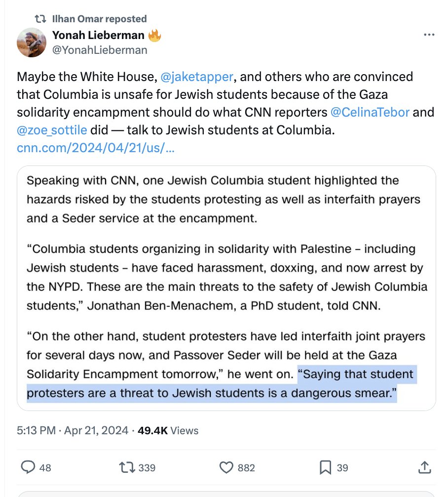 Hamas Congressional advocate @IlhanMN tries to downplay the antisemitism at Columbia by retweeting this dishonest take claiming CNN reporters found Jewish students don't feel unsafe as a result of the antisemitic protests bc one person said so. Of course, the post cuts off the very next sentence of the article where a different Jewish student says the exact opposite. Not to mention several other quotes from Jewish groups on campus saying the fear is legitimate and justified. https://www.cnn.com/2024/04/21/us/columbia-university-jewish-students-protests/index.html