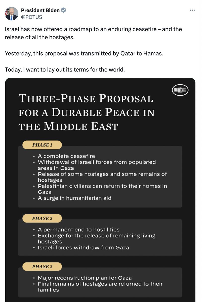 These two statements are completely incompatible. There are really only 2 possibilities here: 1) Biden left out the parts that Hamas would find most objectionable. Phase 2 would need to include some form of demilitarization mechanism/guarantee. There is no way Israel can agree to fully leave Gaza if it allows Hamas to re-arm. That would defeat the entire objective of the war and only ensure another one down the line. 2) Biden waited until Shabbat to release a proposal that is substantively different than the one Israel actually put forward to try to pressure them into a terrible and harmful deal because he views the continuation of the war as politically damaging.