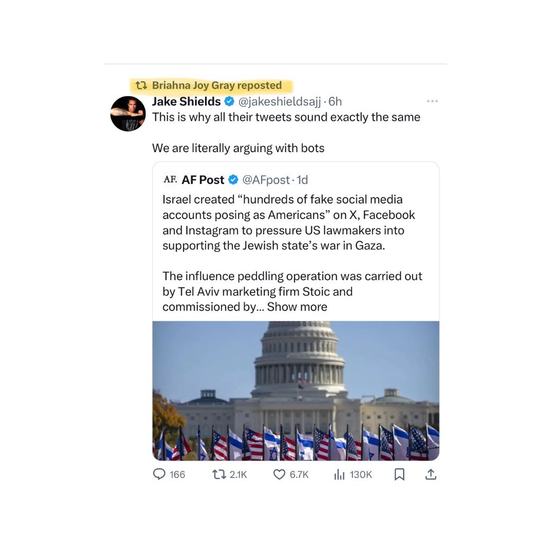 AG @aghamilton29 · Twitter · 2024-06-07 00:49 UTC It’s almost as if she is exactly who we said she was… Shame on people who chose to repeatedly pretend otherwise. Yashar Ali 🐘 @yashar · Twitter · 2024-06-07 00:34 UTC Briahna retweeting Jake Shields of all people…oof.
