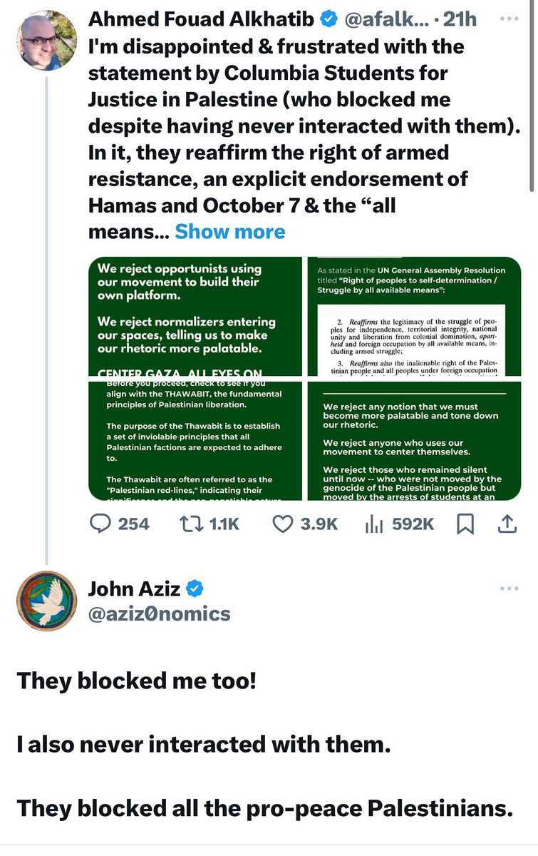 It’s always interesting how often Mehdi can’t help but expose himself. Columbia SJP regularly promotes support for terrorism and terrorist groups. So much so that they preemptively block any Palestinians known for speaking out against terrorism. It’s not “cancel culture” to oppose those who cheer on terrorism. It’s also not cancel culture for platforms to enforce their rules against promotion of violence. Mehdi would want such rules applied to anyone who calls for the murder of Muslims, but here he is white-knighting for a group that explicitly calls for the murder of Jews.