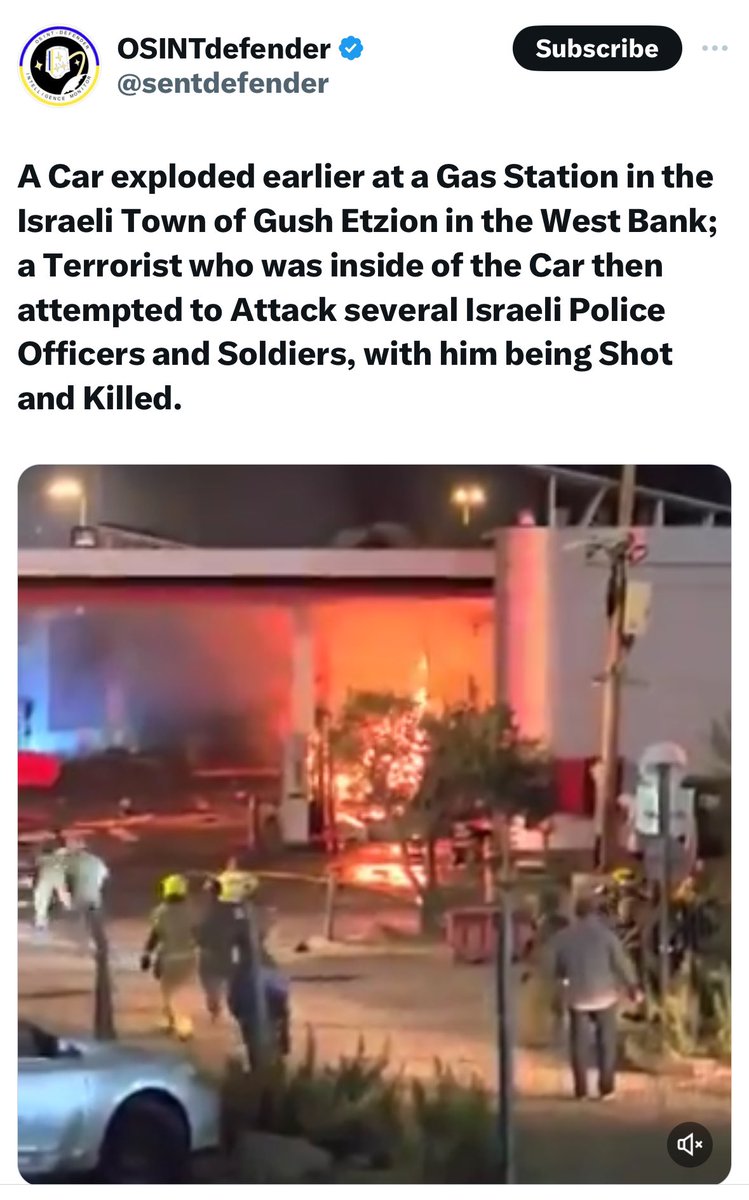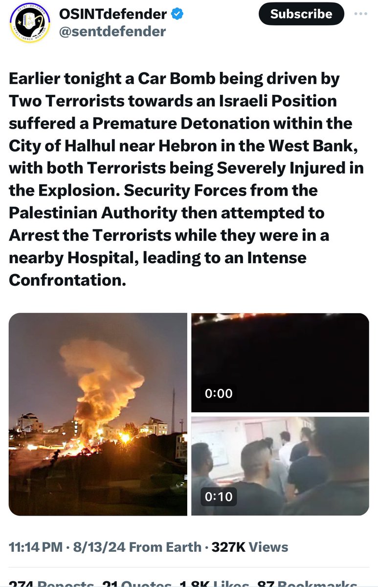 AG @aghamilton29 · Twitter · 2024-08-31 01:03 UTC By my count, there have been 4 suicide or car bombing (including 2 earlier today) attempts by Palestinian militants in just the last several weeks. Each time the bomb has gone off prematurely, injuring or killing the terrorists involved.