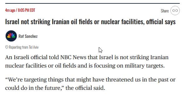 NBC News: "Israel not striking Iranian oil fields or nuclear facilities, official says...'We’re targeting things that might have threatened us in the past or could do in the future,' the official said.'"