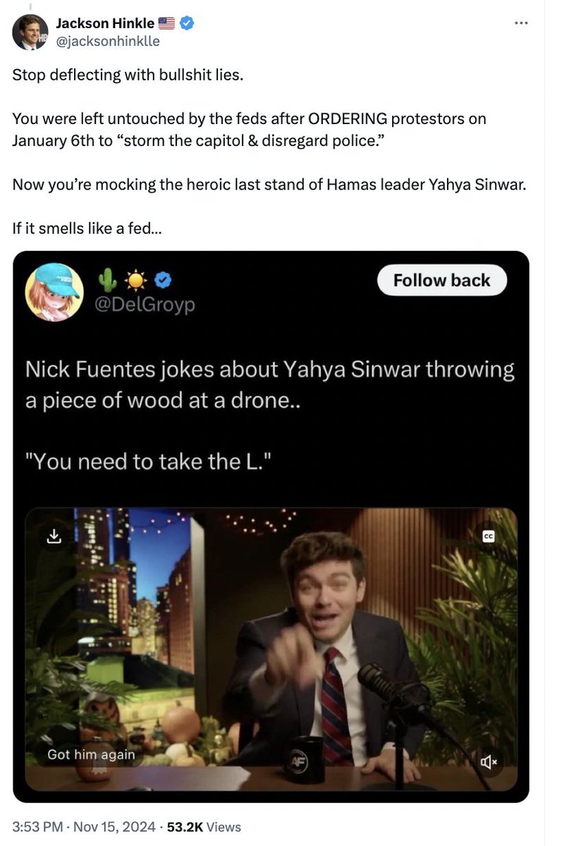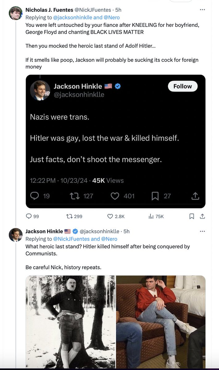 AG @aghamilton29 · Twitter · 2024-11-16 02:30 UTC Hitler's #1 fanboy is fighting with Stalin/Assad 's #1 fanboy over who is the bigger loser. If we are going to do mass deportations, would it really hurt to include these two America-hating clowns in the deal?