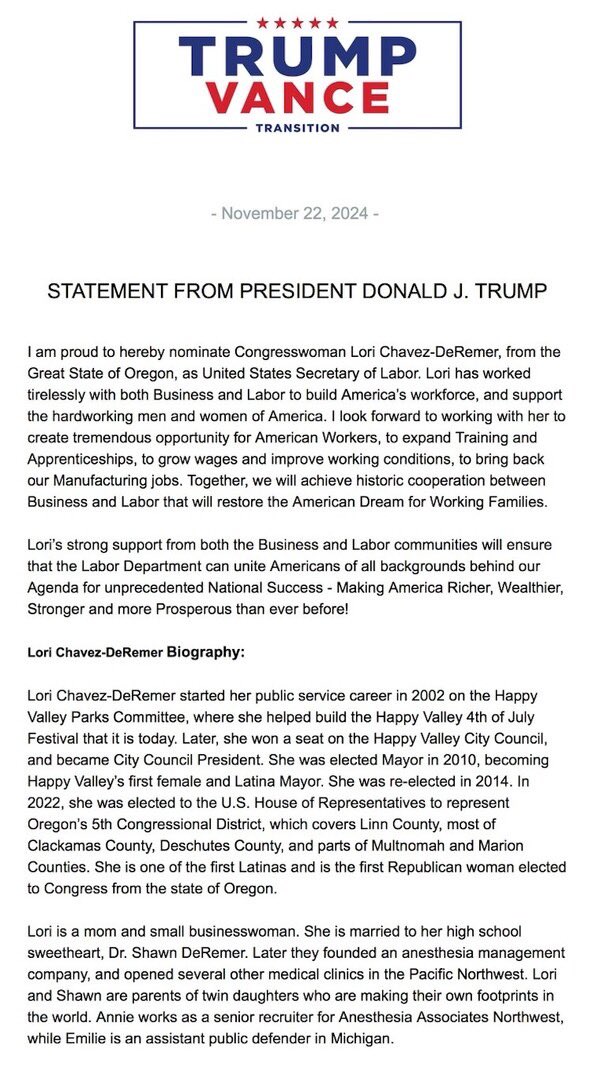AG @aghamilton29 · Twitter · 2024-11-23 00:49 UTC Yikes. She was one of only 3 house Republicans to support the PRO Act, which could have overturned right to work laws in a majority of states. • Meridith McGraw @meridithmcgraw · Twitter · 2024-11-23 00:25 UTC Trump announces @LChavezDeRemer for Labor Secretary:
