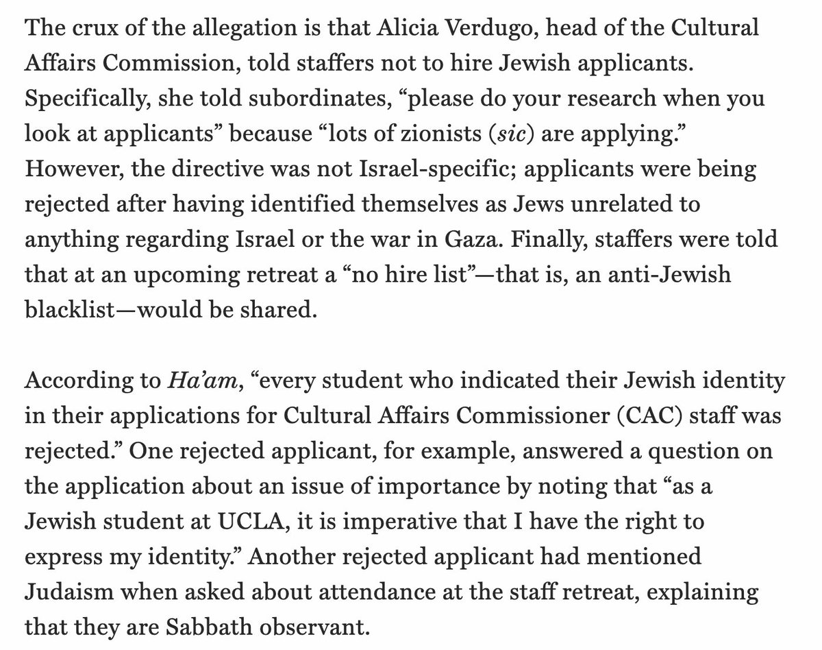 Verdugo was one of the protest leaders who blocked Jewish students from parts of campus so UCLA can't claim they were unaware. By doing nothing, they became complicit in her employment discrimination as the head of the Cultural Affairs Commission. https://www.commentary.org/seth-mandel/the-codification-of-anti-jewish-hiring-policies/