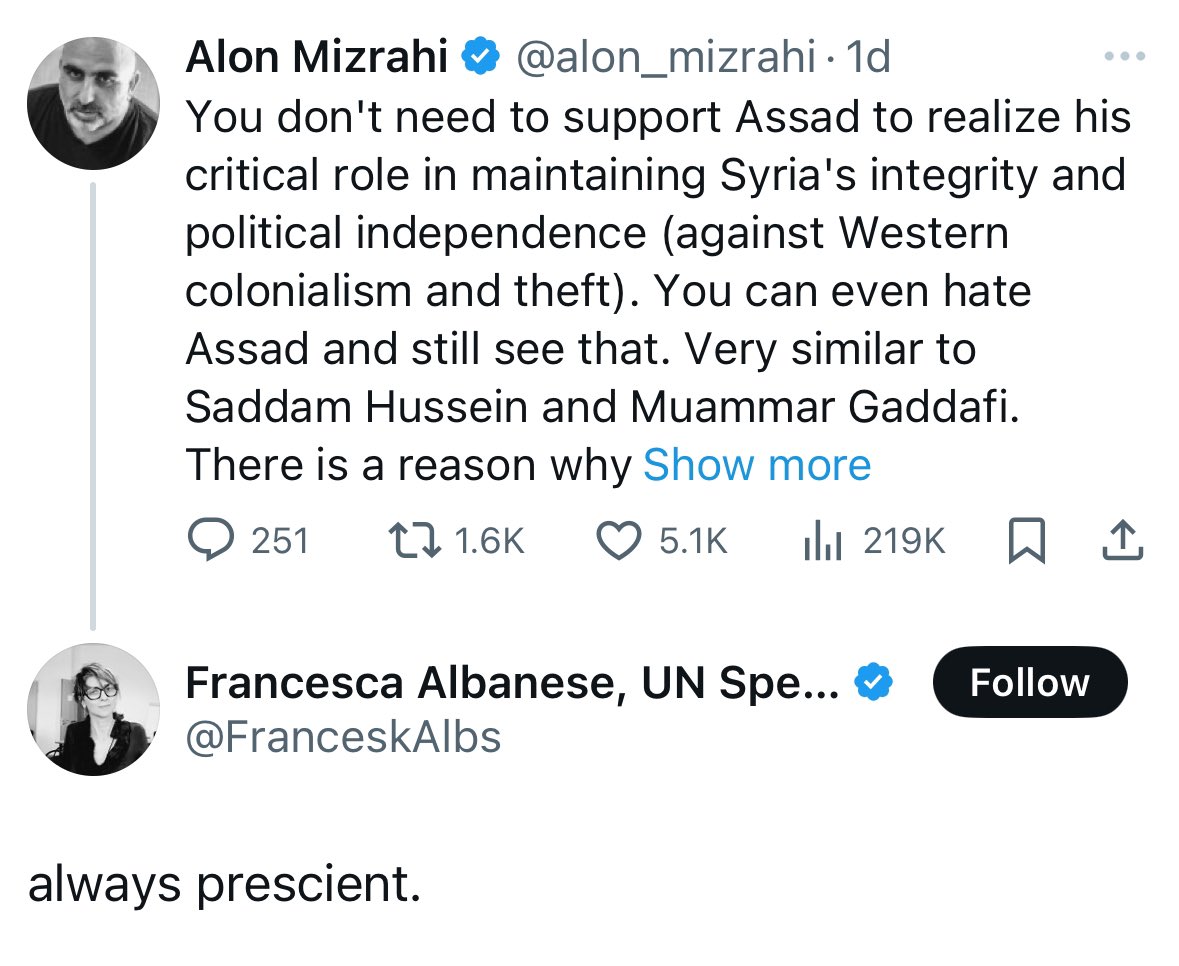 Francesca Albanese being an Assadist is the least surprising development of the past week.