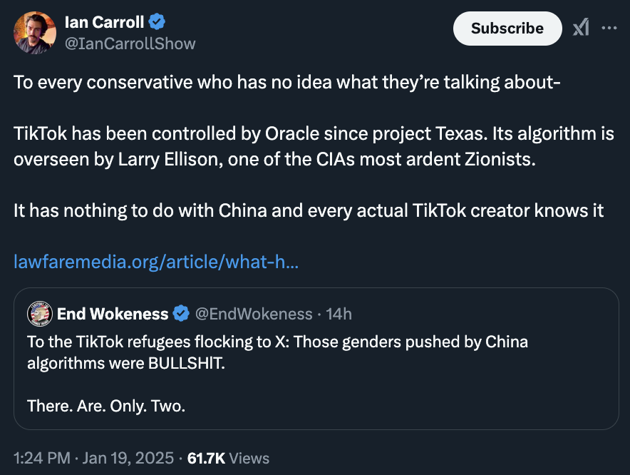 Let me give another example to show Carroll's dishonesty and specific motivations: When everyone was debating TikTok/ByteDance, it should have been an ideal time for someone concerned with theories related to foreign influence on Americans to take advantage and expose stuff. There is an insane amount of evidence suggesting the CCP, and specifically their intelligence agencies, are using TikTok for data collection and to influence Americans. That would seem right up Ian's alley if he was concerned about those issues. But he instead went all-in claiming there was nothing there re China. Instead, he insisted (falsely) that Larry Ellison controlled TikTok's algorithm (thus trying to create a Jewish angle- as he does every time). Of course Ellison has nothing to do with TikTok's algorithm. Oracle stores TikTok data for U.S. users, but the algorithm is fully guarded by the parent company in China. .