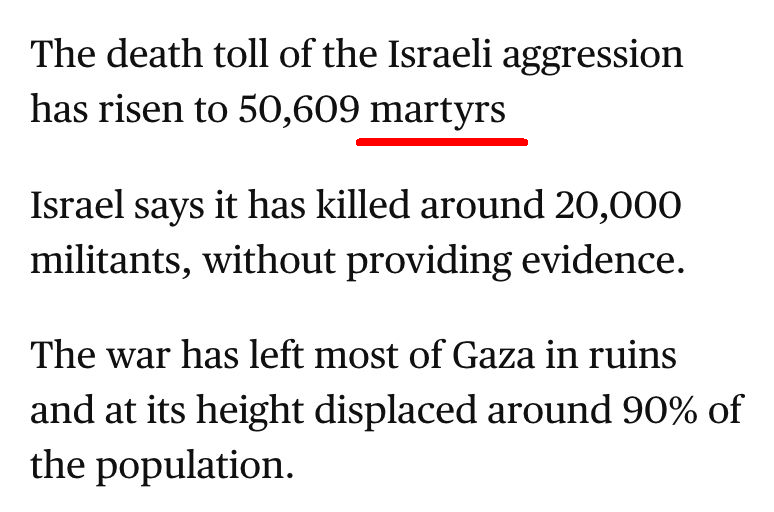 This is a perfect example of the media’s approach throughout the war. The language is a direct copy of the press release from the Hamas-controlled Gaza MoH that day without caveat. Meanwhile, Israeli claims are treated with extreme skepticism (“without providing evidence”).
