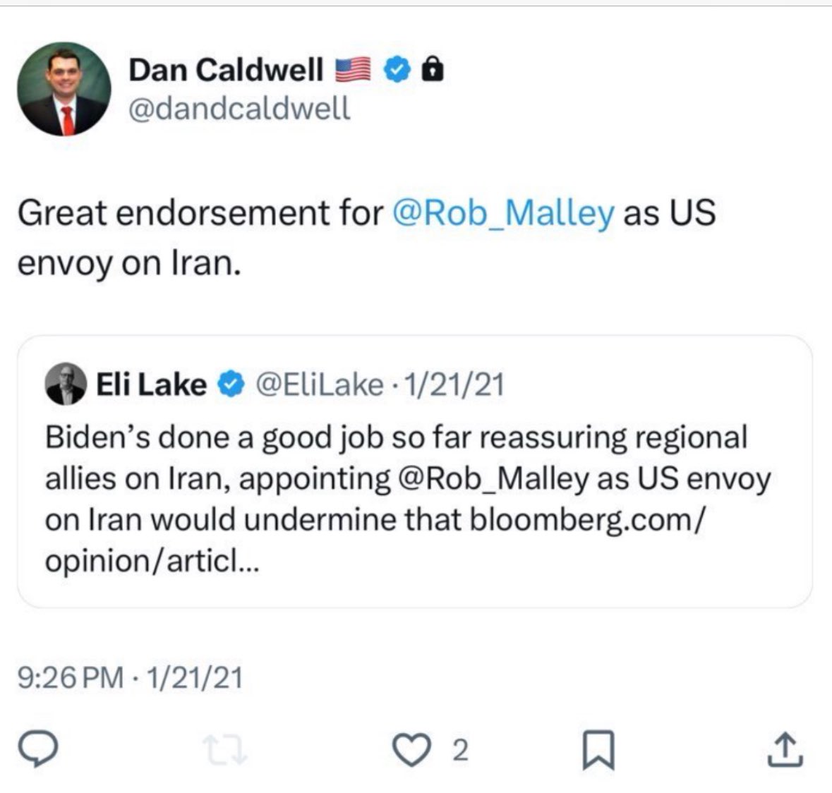 Additional flashback: Caldwell praised appointment of Rob Malley as US envoy to Iran during the Biden admin. Malley would go on to have his security clearance revoked amid an FBI investigation into mishandling of classified docs & a Tehran influence campaign in the State Dept.