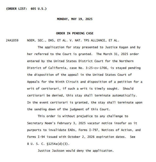 The Supreme Court has sided with the Trump administration (8-1 with Jackson dissenting) to stay an injunction from the lower court blocking the March cancellation of parole for migrants under the Biden administration's CHNV program.