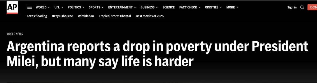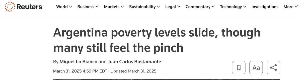 Milei's policies were predicted to lead to "devastation," but instead reduced poverty, cut chronic inflation, and led to substantial growth. Yet the press seems not to want to give him credit. Ex: Here is how Reuters and the AP reported on the reduction in poverty.