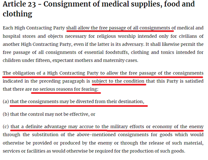 International law makes clear Israel can cut off aid to Gaza if it "fears" Hamas will benefit or steal it. Of course this is true. Everyone claiming Israel is violating the law by halting aid or cutting electricity has not read Geneva Conventions. Or they have but lie anyway.