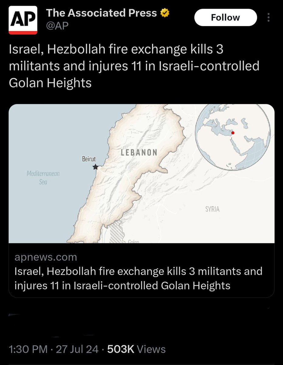 The Associated Press when Israel hits a Hamas military base built inside a school: "Israeli airstrike has hit a school killing at least 30." The Associated Press when Hezbollah bombs children playing soccer: 'Israel, Hezbollah fire exchange." It's every story, every day.