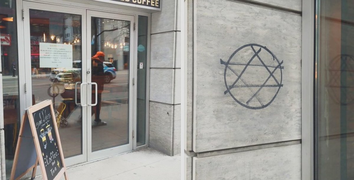 A new Jewish-owned Goldstruck Coffee location opened at Yonge & College St in @cityoftoronto, and as with other locations, has been immediately vandalized with an Magen David, similarly to how Jewish businesses were identified in Nazi Germany. All under @MayorOliviaChow's watch