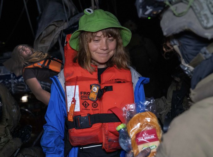 • Aviva Klompas @avivaklompas · Twitter · 2025-06-09 16:45 UTC Greta claims she was kidnapped when she was escorted off a yacht and offered snacks. vs. October 7, barefoot civilians dragged from their homes at gunpoint by Hamas.