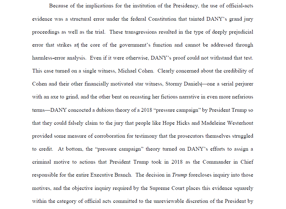 NEW: Trump immunity motion to vacate NY conviction: "Because of the implications for the institution of the Presidency, the use of official-acts evidence was a structural error under the federal Constitution that tainted @ManhattanDA grand jury proceedings as well as the trial."