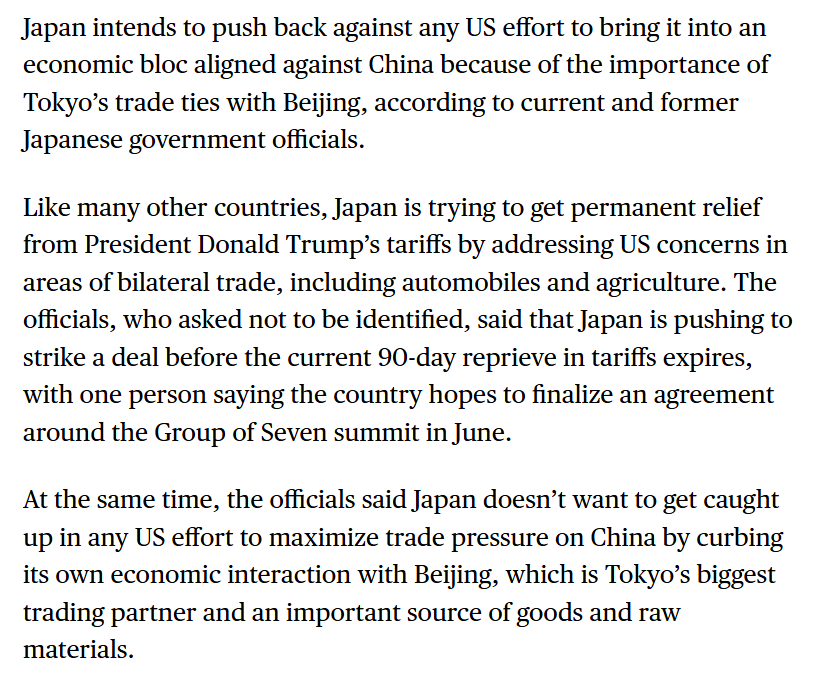 Japan will not take part in any trade bloc that seeks to isolate China, given the importance of China as a trading partner. https://www.bloomberg.com/news/articles/2025-04-24/japan-to-resist-trump-efforts-to-form-trade-bloc-against-china