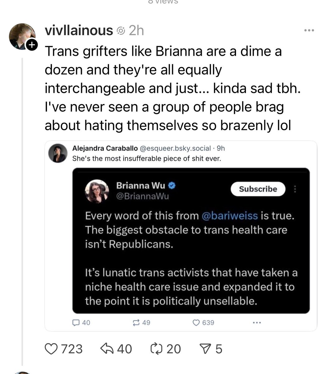 The real trans grifters are the ones that took a movement that had made progress for 40 years and destroyed it in five. The Republicans suck. But the reason they have so much traction right now is because of what “trans” has devolved into - an extremist movement to destroy gender, confuse children into getting medical treatment and synonymous with antisemitic terrorism. My trans politics are dead centrist. If I seem extremist to these people, it’s because they live on another planet. We will lose everything on this course.