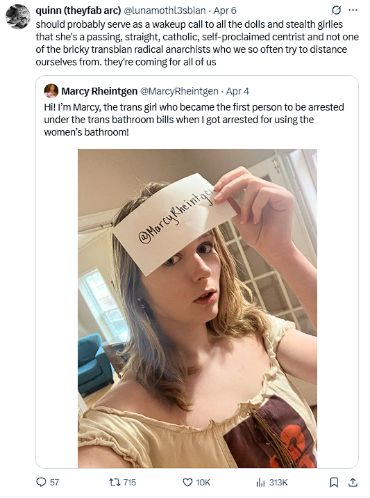 These people can go fuck themselves. They’re not coming for “all of us.” The “bricky transbian anarchists” in Seattle don’t have to worry about bathroom bans. “Bricky transbian anarchists” in blue areas spent years advocating for the sale of black market hormones to children