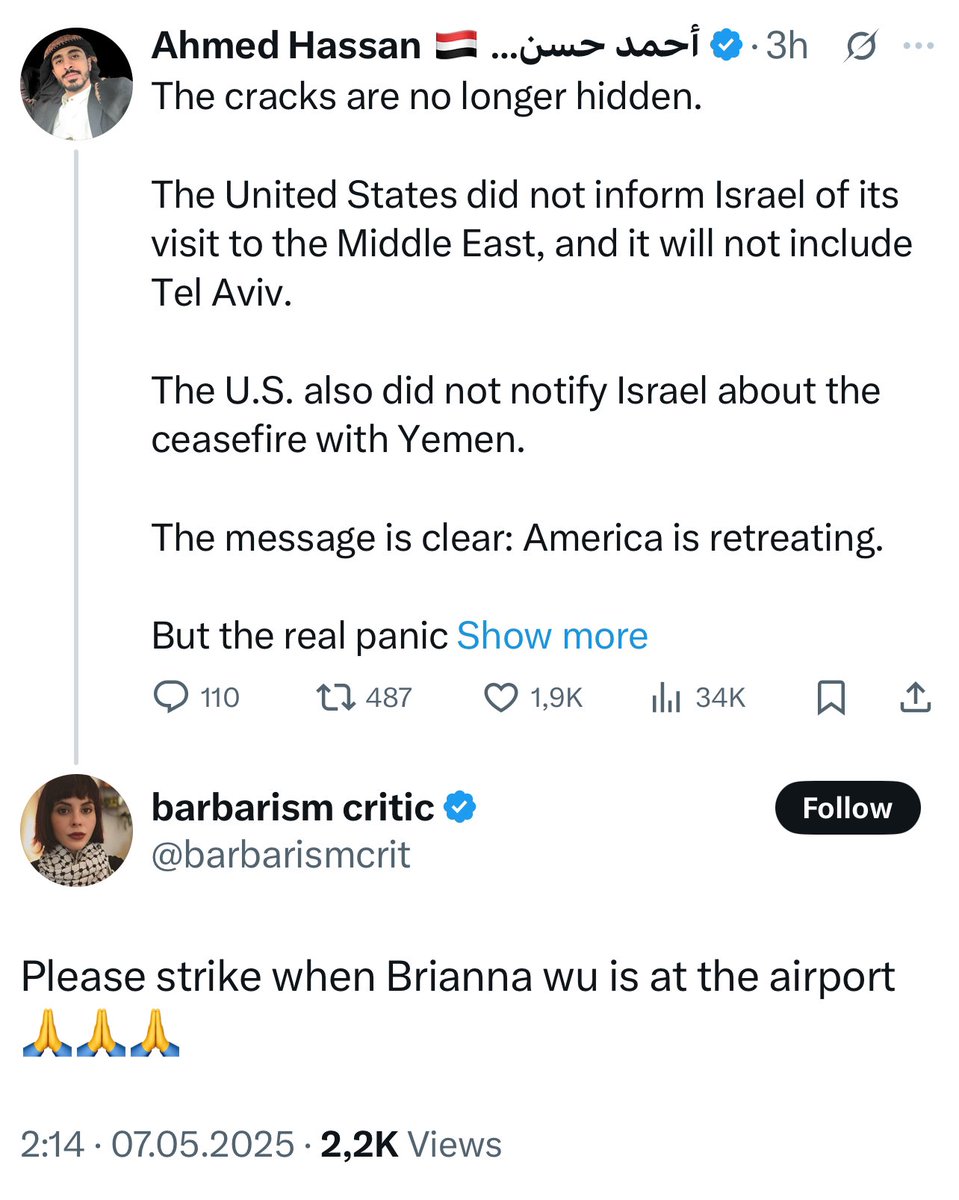Houthis are mostly a disturbance for Israel and Israelis and not more, but calling for a death of another person, in this case @BriannaWu – should lead to a permanent suspension on @X for @/barbarismcrit (+40k followers, btw) Any comment, @elonmusk?