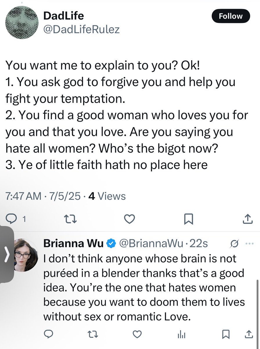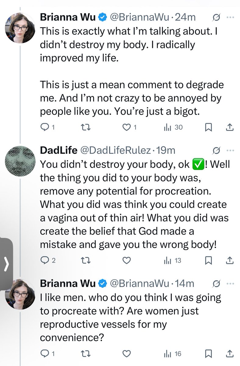 One of the top ways transsexuality is fearmongered is over loss of reproductive capability. I like men. Who exactly was I going to have a baby with? Well, here’s their plan. They expect us to repress that attraction, pretend to be into women, marry them, and treat them as baby making machines. No part of their brain asks if this is fair to women. It is deeply misogynistic to expect women to marry and have babies with people who will never love them romantically.