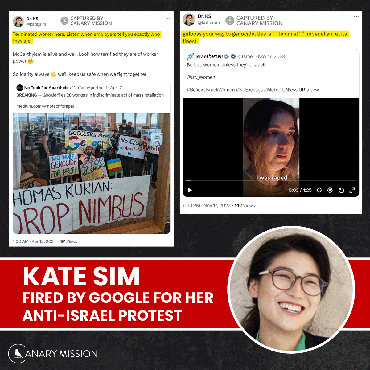 Kate Sim was fired by Google for her anti-Israel protest. Turns out you can't attack your employer w/o consequences. Sim calls Israeli women reporting Hamas rape "'feminist' imperialism at its finest." No surprise, she majored in gender studies at Harvard. https://canarymission.org/individual/Kate_Sim
