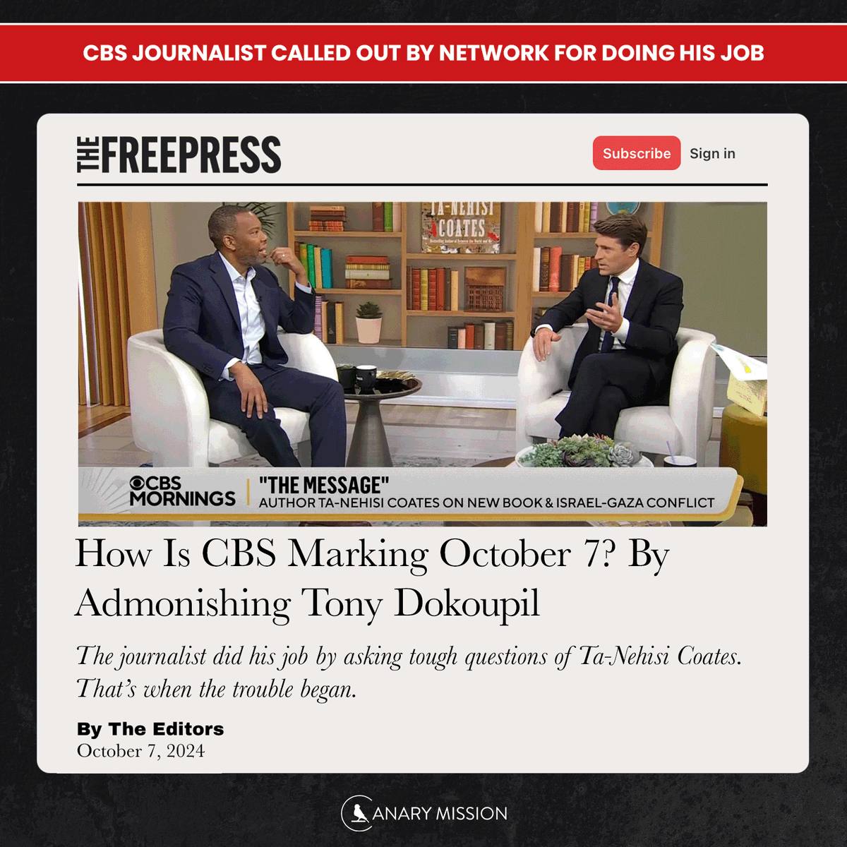 The objectivity of MSM outlets has been lost for a long time. This is just another nail in the coffin: After a respected @CBS journalist did his job by grilling Ta-Nehisi Coates on his one-side anti-Israel book, the network apologized to the staff. https://www.thefp.com/p/cbs-marks-october-7-by-admonishing-tony-dokoupil