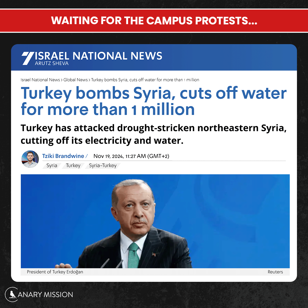 Canary Mission @canarymission · Twitter · 2024-11-19 16:00 UTC Waiting for the campus protests against Turkey for cutting water from 1M people. https://www.israelnationalnews.com/news/399424