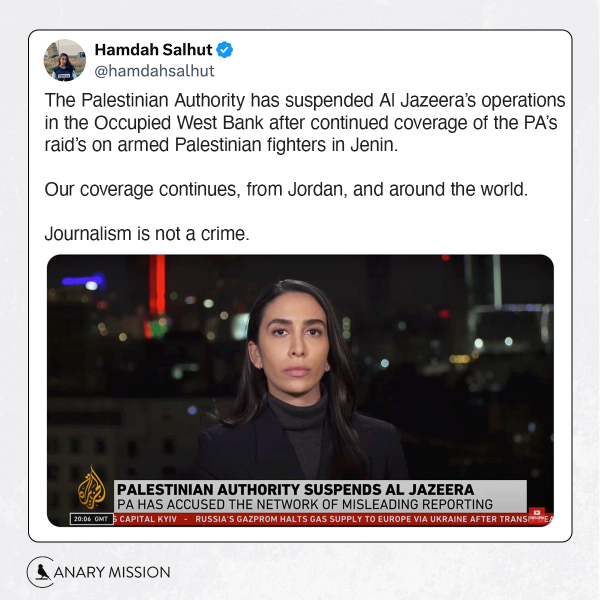 • Canary Mission @canarymission · Twitter · 2025-01-03 15:00 UTC If Saudi Arabia, Jordan, the UAE, Bahrain, Egypt, Israel and now the Palestinian Authority ban you for supporting terrorism, then your journalism is probably a crime. https://canarymission.org/organization/Al_Jazeera_Media_Network