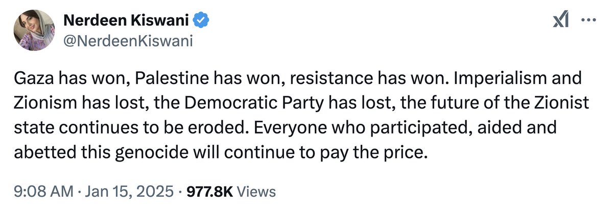So, according to @NerdeenKiswani, the slaughter of innocents (many of whom had dedicated their lives to helping the Palestinians), rape and the kidnapping of women, children, babies & the elderly have all won. And the (nonexistent) genocide of her "people" for a terrorist group that absconded with billions of dollars in international aid to live in the lap of luxury in Qatar was worth it. Only a psychopath can think this way.
