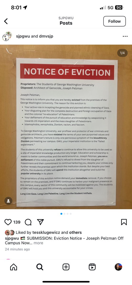 “If you choose to remain on campus...every sector will be mobilized against you.” ➡️Fresh back from a semester-long suspension, @GWUSJP targeted Int'l Affairs Prof Joseph Pelzman, author of Trump's Gaza plan, with an "eviction notice." 🩸Using language that would make Nazis proud, SJP declared Pelzman a “pernicious symptom of the bloodthirsty Zionism permeating this campus.” 🚨SJP will also be holding a “First Intifada Teach-In” on March 4 ON CAMPUS. @GWtweets, WHERE IS YOUR SPINE?