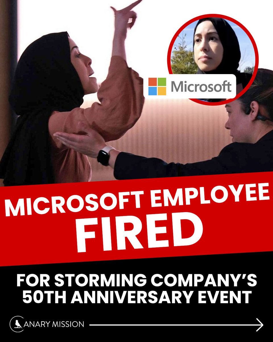 Canary Mission @canarymission · Twitter · 2025-04-08 19:51 UTC Update: Microsoft employee fired after disrupting company's 50th anniversary celebration