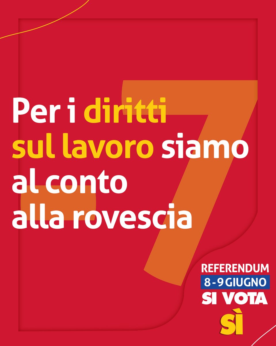 • CGIL Nazionale @cgilnazionale · Twitter · 2025-06-01 09:00 UTC Per i diritti sul lavoro siamo al conto alla rovescia. Mancano solo 7 giorni al #Referendum2025 L’8 e 9 giugno fai sentire la tua voce! #insiemeperilreferendum #Lavoro #Diritti #Cittadinanza #CGIL