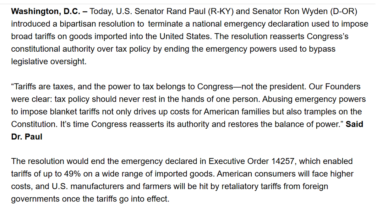 NEWS: Sens. Rand Paul and Ron Wyden have teamed up to introduce a resolution that would terminate the national emergency underpinning *all* the tariffs Trump announced last week: "Tariffs are taxes, and the power to tax belongs to Congress," Paul says.