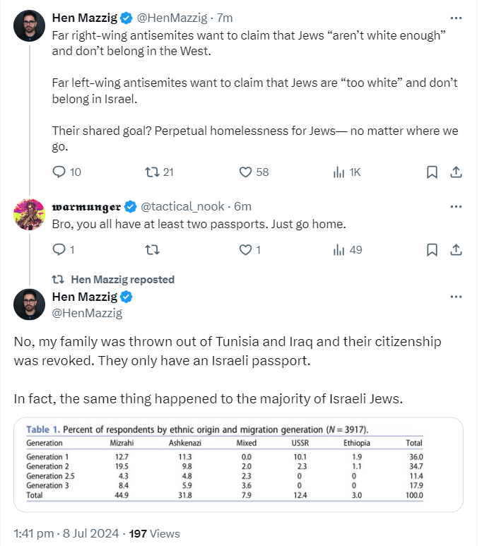• Daniel Sugarman @daniel_sugarman · Twitter · 2024-07-08 12:46 UTC It is *so* convenient for "anti-Imperialists" to pretend that all Israelis are evil white colonialists who could easily return to the countries they came from. It's not remotely true. And they *know* it's not remotely true.