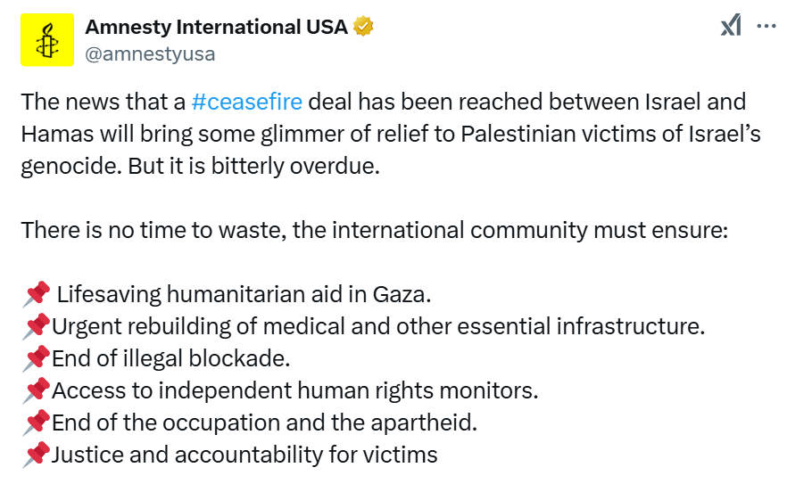 Daniel Sugarman @daniel_sugarman · Twitter · 2025-01-19 11:52 UTC Amnesty International was set up specifically to advocate for prisoners. 64 years later, the organisation cannot bring itself to acknowledge those who have been taken captive by Hamas.
