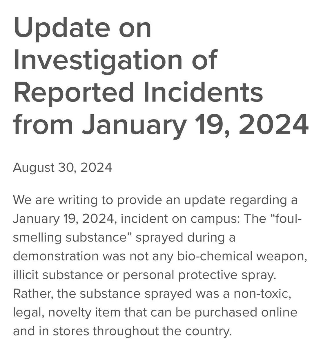 8 months later, Columbia has corrected the narrative about the alleged “chemical weapon” incident in a discrete Friday afternoon update to their website: “the substance sprayed was a non-toxic, legal, novelty item.” This modern day blood libel enabled the dehumanization, bullying, and harassment of Israeli and Jewish students. @Columbia knew the truth for months and did nothing because they do not care about their Jewish students.