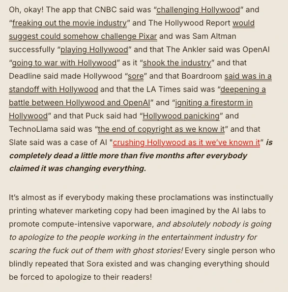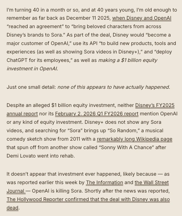 This week OpenAI killed Sora 2, a product that was the catalyst for a supposed $1bn investment with Disney. The deal was a mirage. No money was sent, nothing came out of the partnership, and yet the media screamed that this was the end of Hollywood. https://www.wheresyoured.at/premium-how-much-of-the-ai-bubble-is-real/
