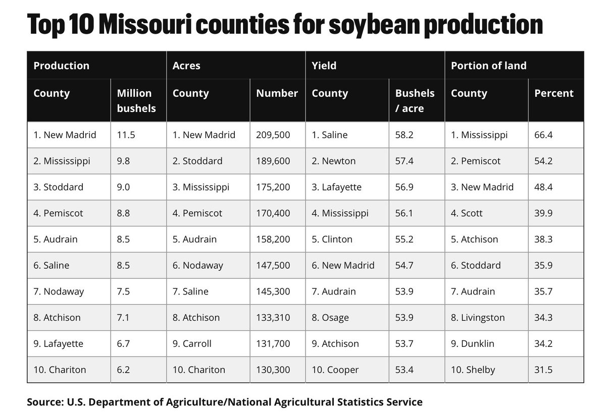 These are the top Missouri counties for soybean production sorted by production, acres, yield and portion of land. Every single one of these counties voted for Donald Trump. Every single one of these counties is represented by a Republican in the U.S. House. /3