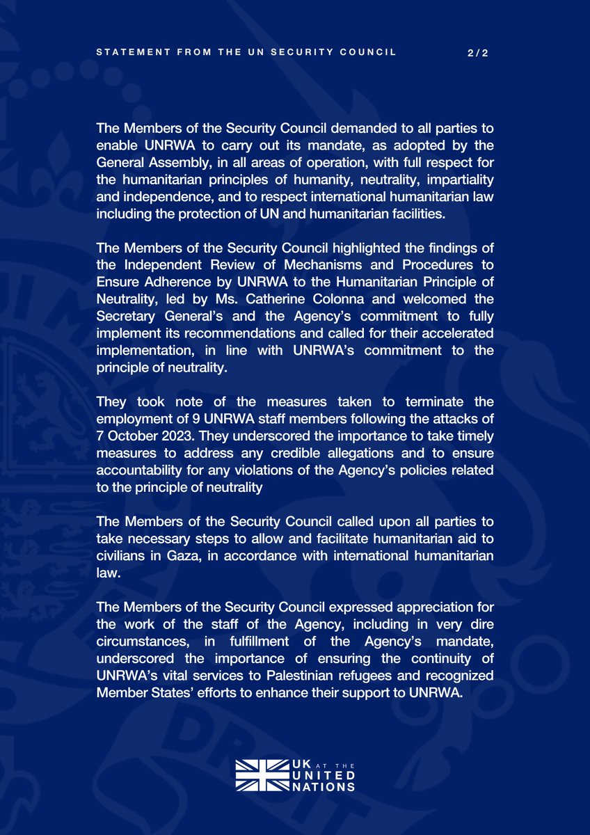 The Security Council has strongly warned against any attempts to dismantle or diminish @UNRWA’s work. Doing so would have severe consequences for millions of Palestinians. The Council demands UNRWA be able to carry out its work.