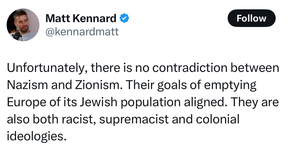 Eylon Levy @eylonalevy · Twitter · 2025-01-22 13:20 UTC Nazis want Jews to die. Zionists want Jews to live. It’s a pretty fundamental difference.