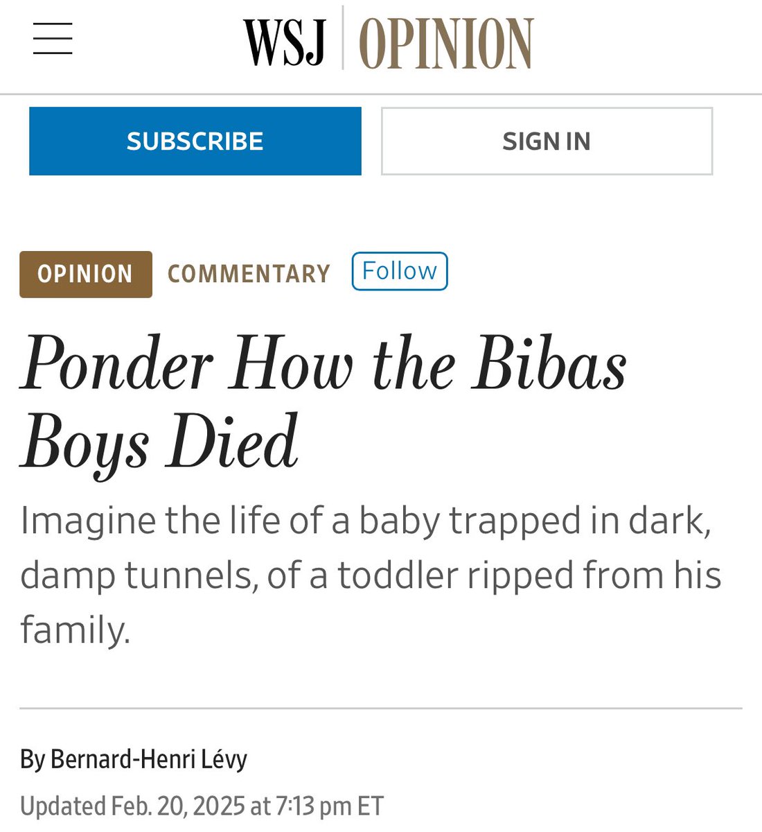 Eylon Levy @eylonalevy · Twitter · 2025-02-21 06:30 UTC Bernard-Henri Levy: “Did the captors change Kfir’s diapers, or did they let him sit in his own filth until his skin burned?” ~ via @WSJ