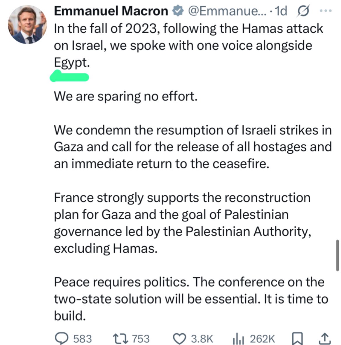 That’s exactly the problem. After Gaza invaded Israel on October 7, France should have spoken with “one voice” alongside ISRAEL. Now, having done nothing useful and so much damage, France is left with wishful thinking that Hamas will disappear.